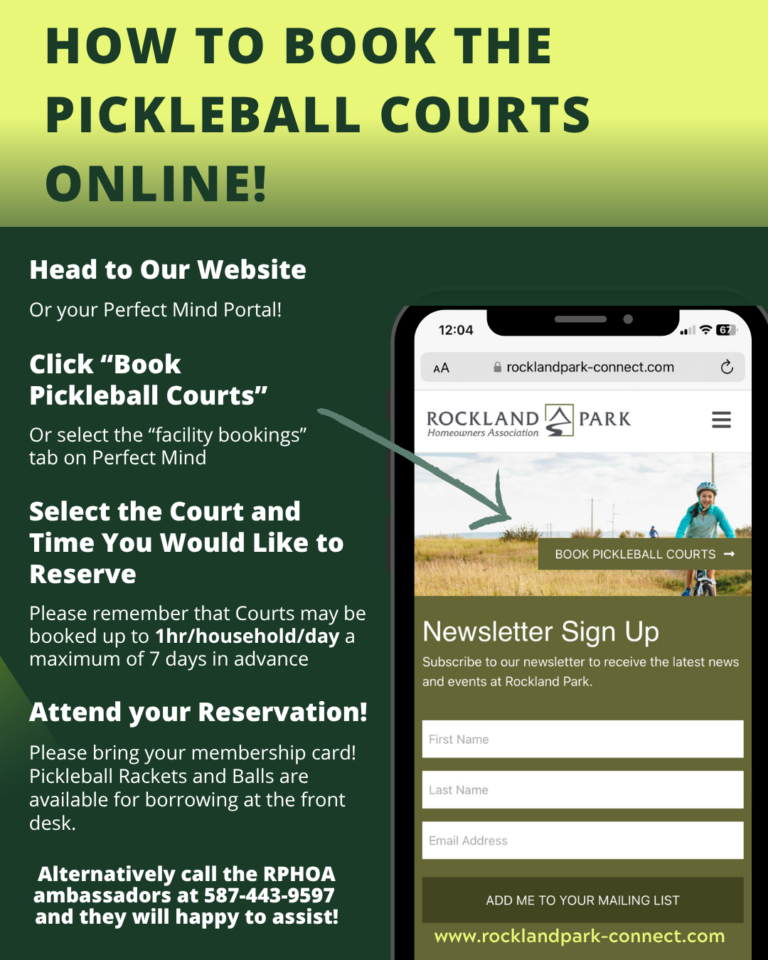 (Complete instructions shared in the image in the image below).  Courts can be reserved up to 7 days in advance (max 1 hour per household per day).  Don’t forget your membership card—and if you need equipment, paddles and balls are available to borrow at the front desk!