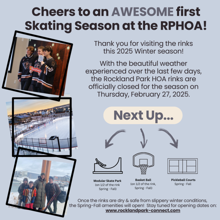 It sounds like the Rockland Park Homeowners Association (RPHOA) rink season wrapped up with a great time had by the community! The closing of the rinks for the season on February 27, 2025, marks the end of ice activities, but it’s exciting that new outdoor amenities are on the horizon!